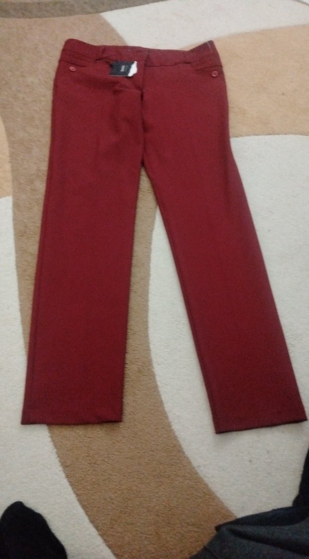Bordo renkli, düğmeli, normal boy midi kesim kadın kumaş pantolon. Sentetik kumaştan yapılmış, ofis için uygun sade ve rahat bir model.