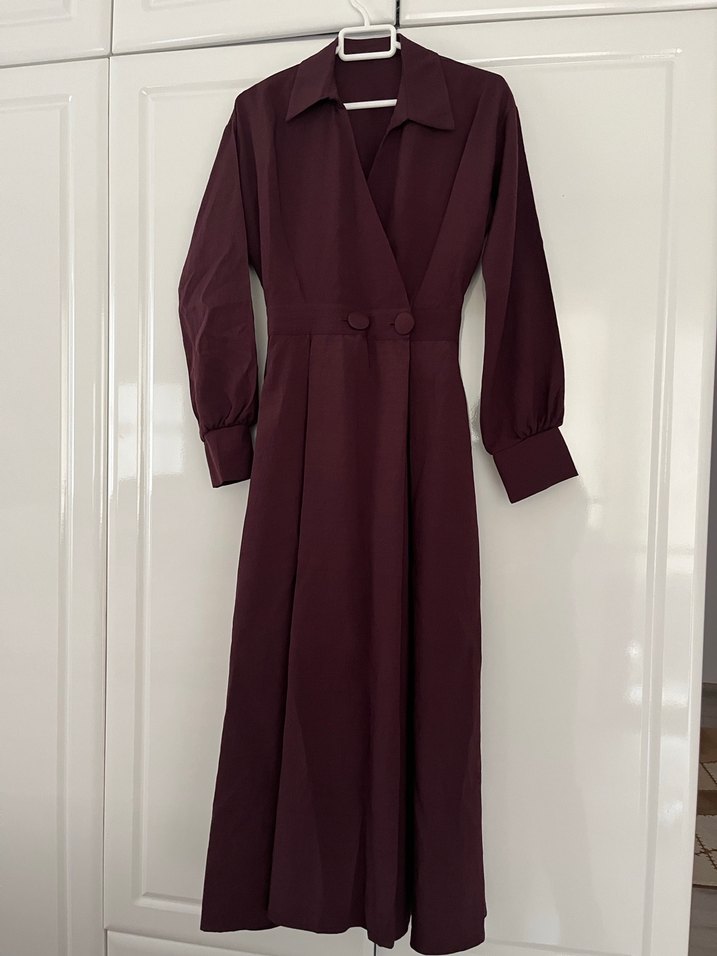 Bordo renkli, düğmeli uzun elbise, yaka kısmı kesik yakalı ve uzun kolludur. Ofis için uygun, klasik zarif ve modern klasik stilde, sentetik kumaştan yapılmıştır.