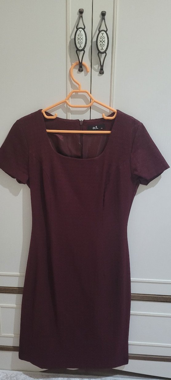 Bordo renkli, kare yakalı, kısa kollu ve sade ve şık kadın elbisesi. Günlük kullanıma uygundur.