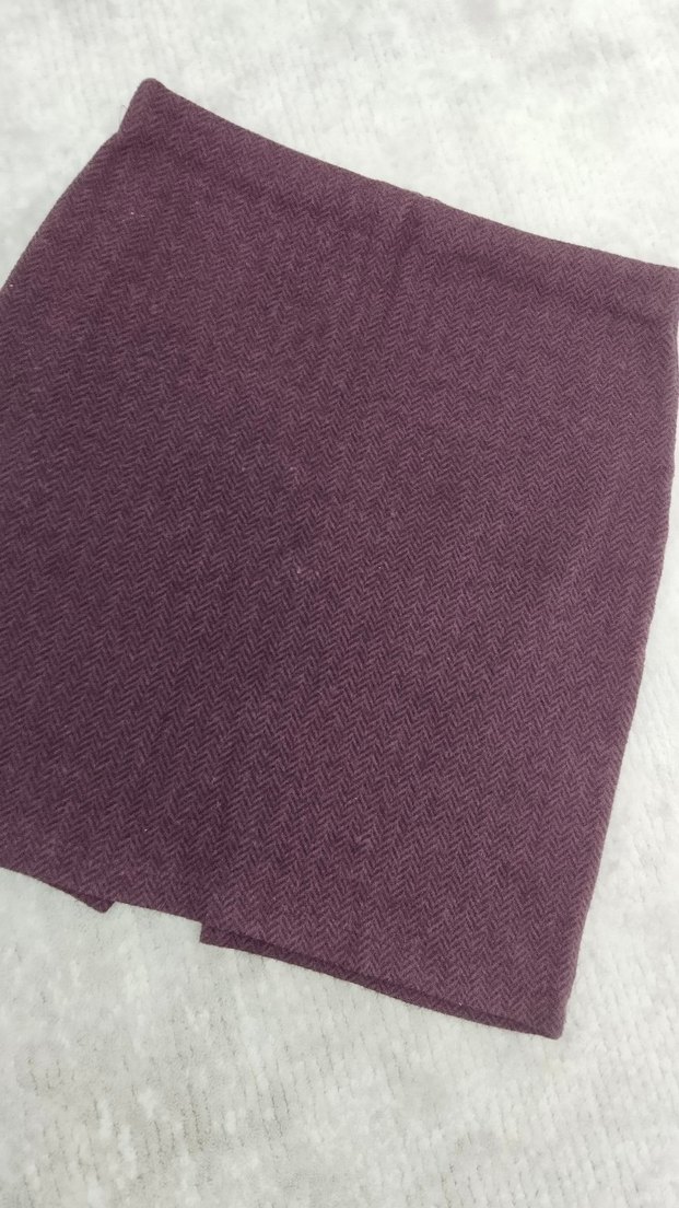 Bordo renk, normal kesim kadın eteği. Yumuşak pamuklu kumaştan üretilmiş, ofis ve rahat normcore tarzına uygun.