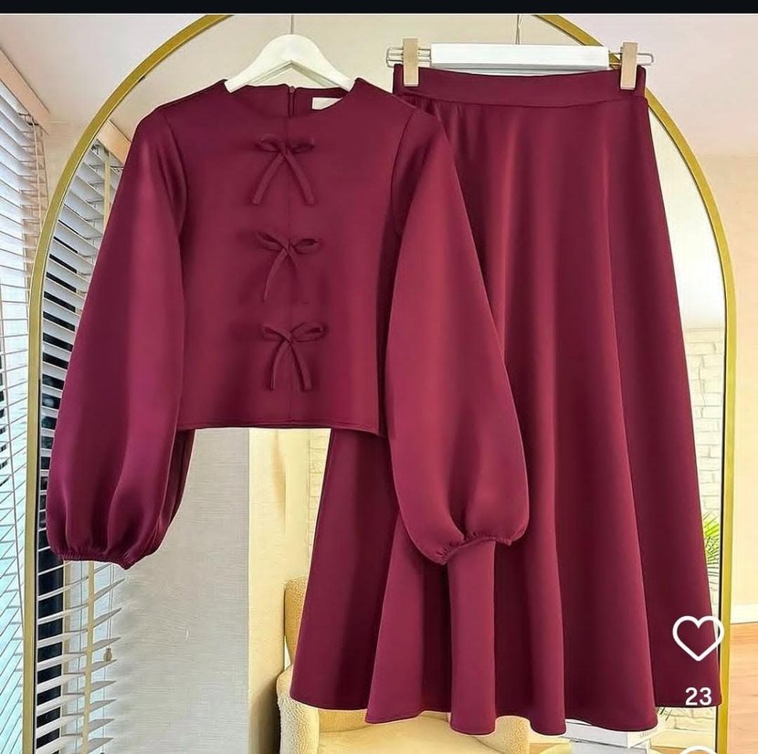 Bordo yuvarlak yaka ve uzun kollu kadın etekli takımı. Üst kısmında fiyonk detayları bulunur, etek uzun ve desensizdir.