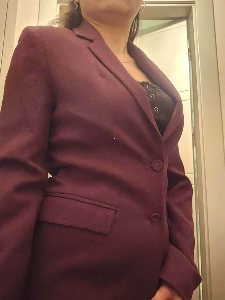 Bordo renkli, düğmeli kadın blazeri, keskin yaka ve uzun kollu tasarımıyla ofis için uygun, normal kesim ve kendinden hafif simli kumaş. fabrika marka. 34 beden.