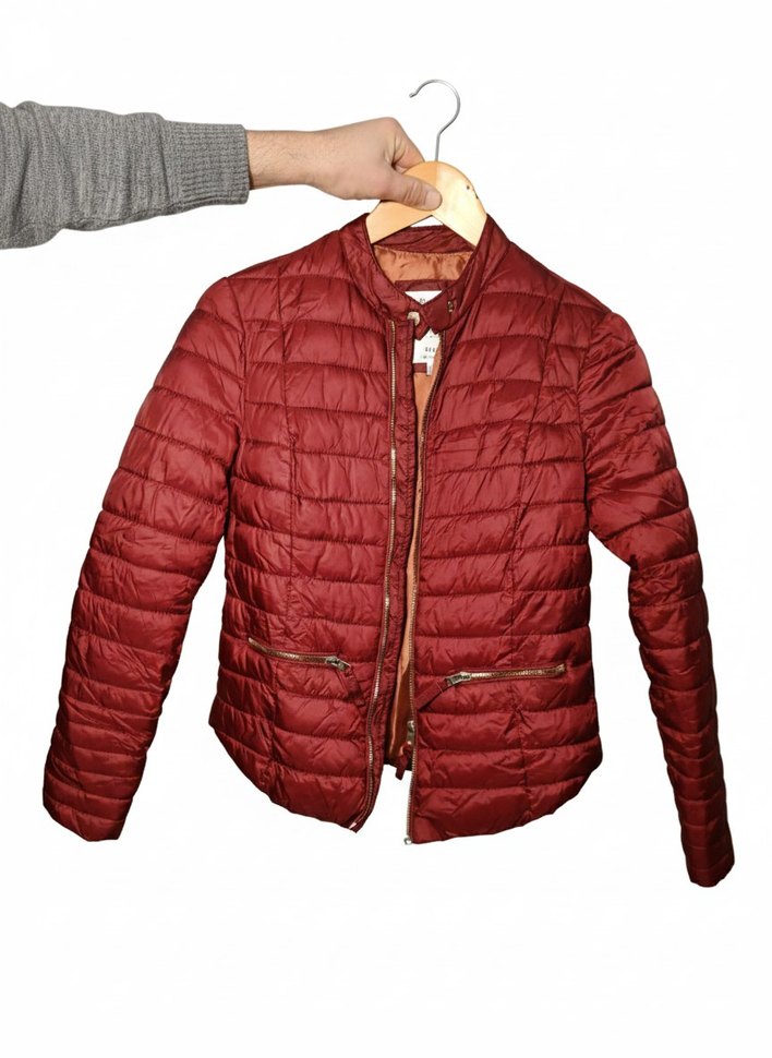 Bordo renkli, fermuarlı, dar kesim kadın ceketi. Notlu yaka, uzun kollu ve parlak sentetik kumaştan, günlük sokak tarzına uygun midi boyda.