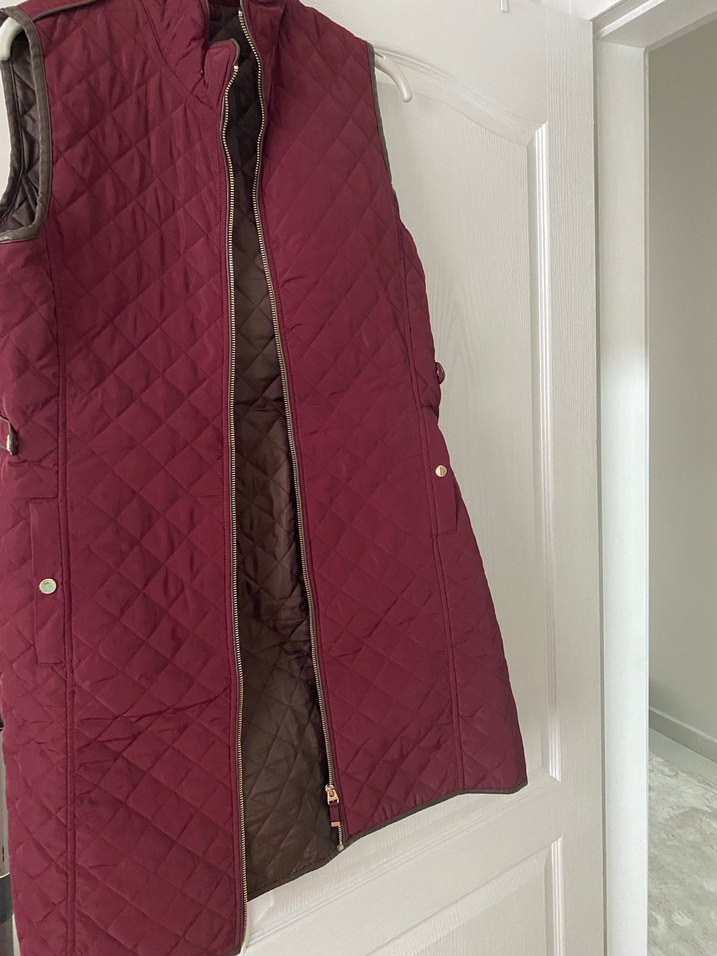 Bordo renkli, fermuarlı ve kolsuz, normal boyda, kapitone dokulu kadın yelek. Rahat ve sade, günlük sokak stili için uygundur.