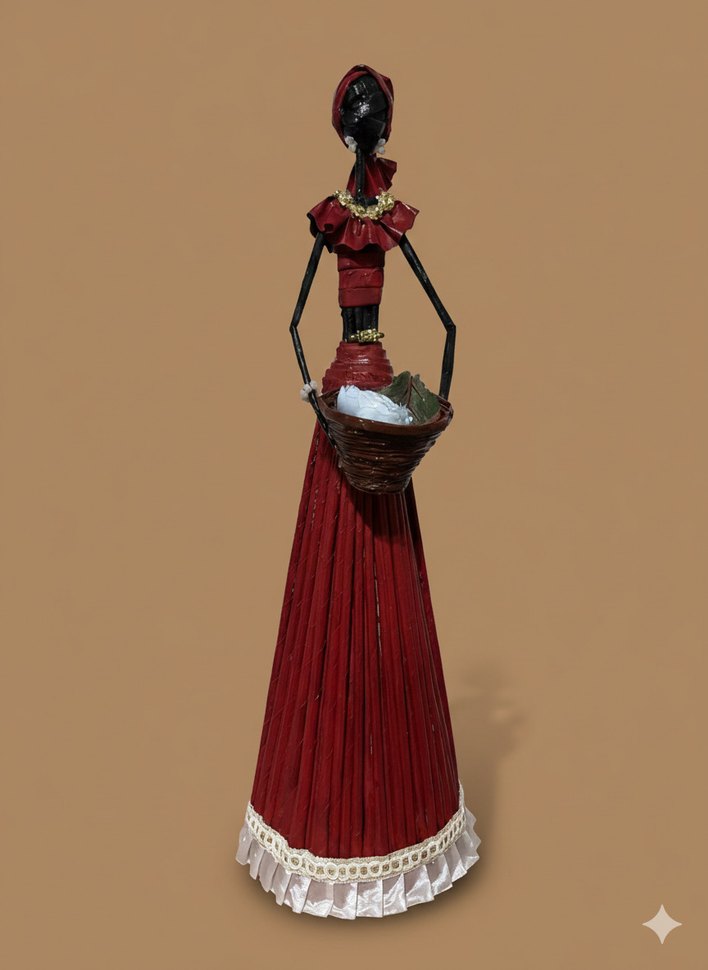 Bordo renkte, uzun elbise giymiş ve sepete sahip kadın figürini. Etek kısmında dantel detayları bulunur. Sanatsal ve rustik bir görünüm sunar.