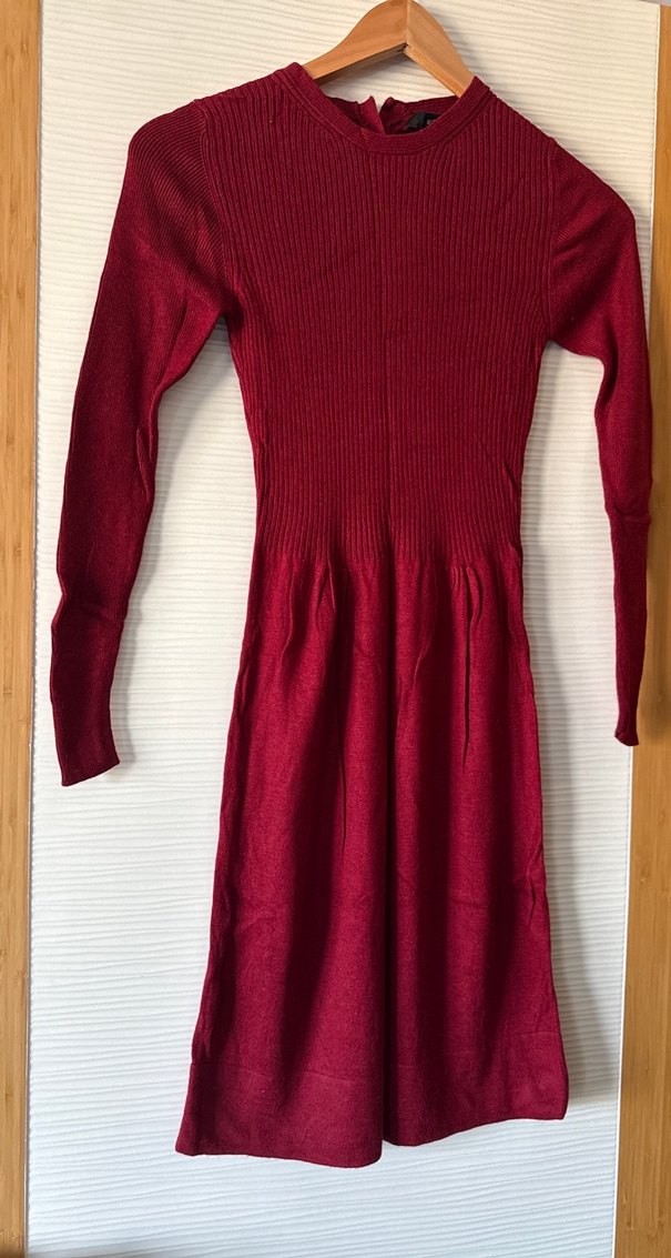 Bordo renkli, fit kesim, uzun kollu ve bisiklet yaka triko elbise. Midi boy ve yumuşak triko kumaştan üretilmiştir, günlük kullanım için uygundur.