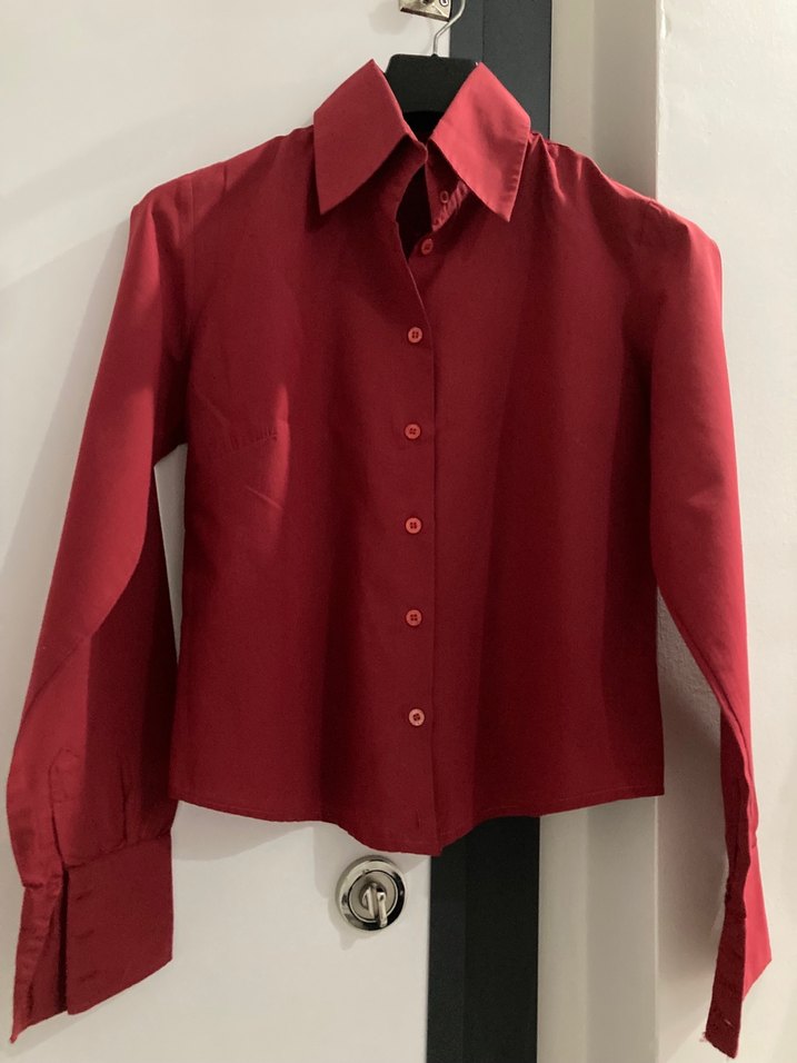 Bordo renkli, yakalı ve düğmeli kadın gömleği uzun kollu ve normal boyda, ofis kullanımı için uygundur. ✨