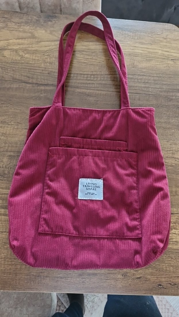 Bordo renkli, yumuşak dokulu kumaştan kadın çantası, ön cepli ve baskılı etiketli, bohem tarzda şık ve rahat kullanım için uygun.