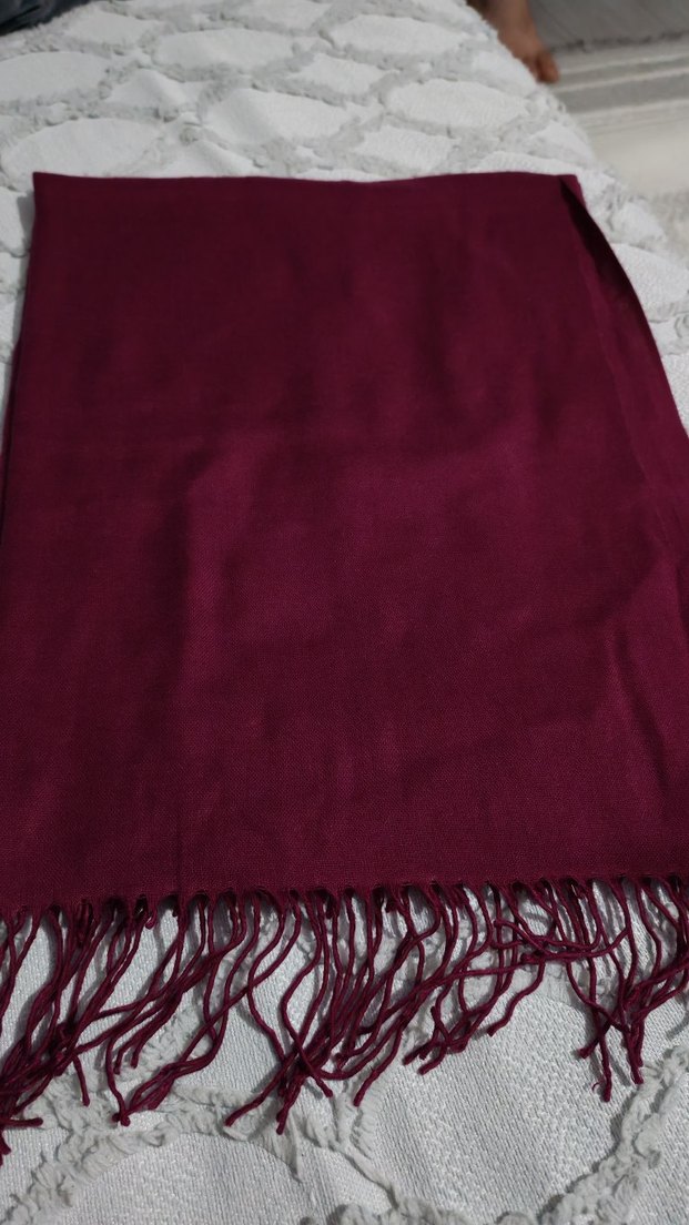 Bordo renginde, ipek görünümlü, şal tarzında kadın aksesuarı. Püsküllü kenarları ve rahat, sade tasarımı ile bohem stil için uygundur.