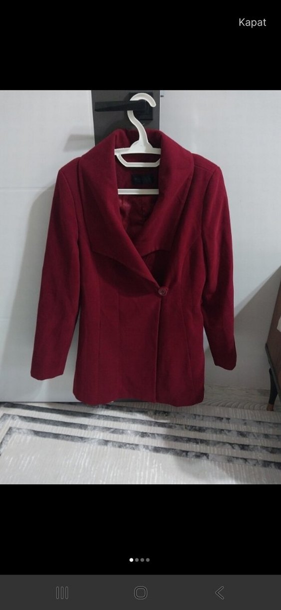 Bordo renkte, tek düğmeli ve geniş yakalı kadın kabanı. Yumuşak dokulu ve vücuda oturan kesimiyle soğuk havalar için uygundur.