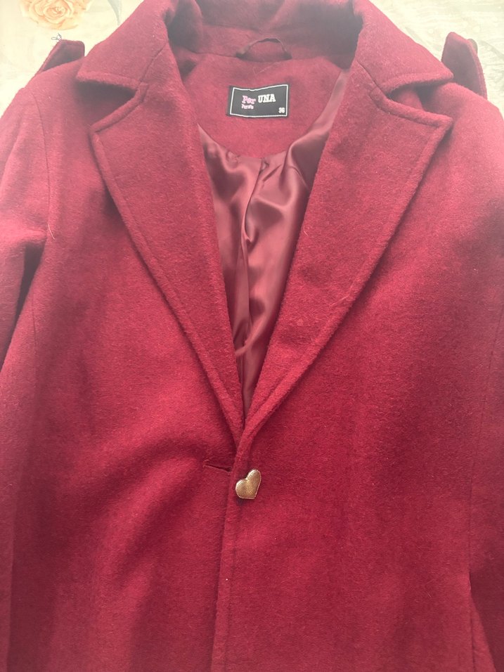 Bordo renkli kadın kaban, yumuşak ve sıcak kumaş, saten astar ve kalp şeklinde düğme ile kapanır. ❤️