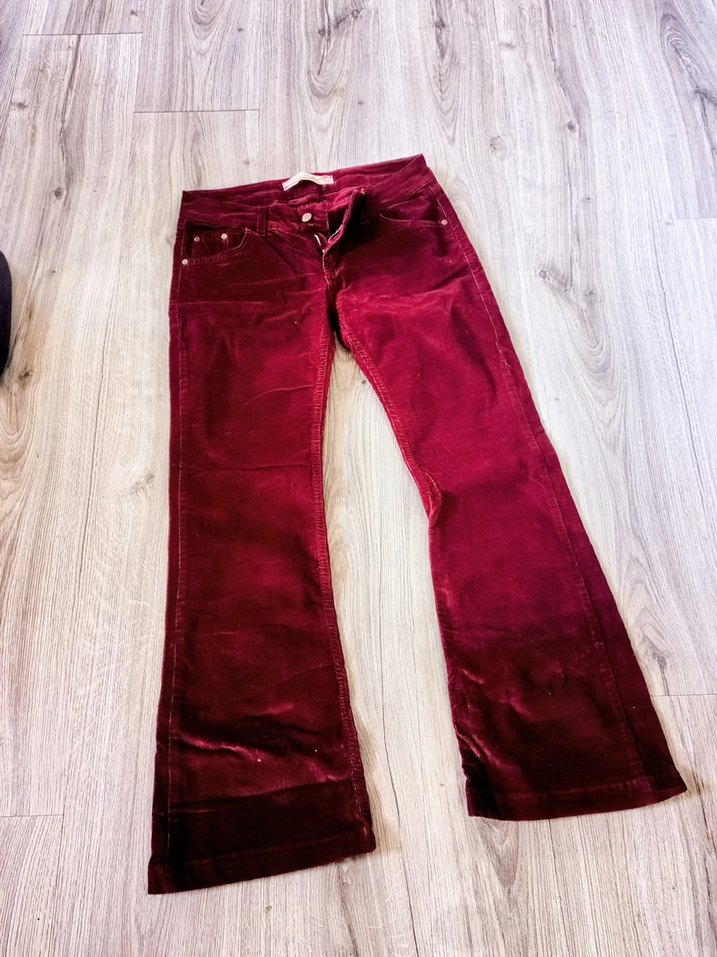 Bordo kadife kumaştan, bol kesim ve düğmeli detaylı pantolon. Parlak yüzeyiyle romantik buluşmalar için uygun, midi boyunda ve günlük sokak tarzı.