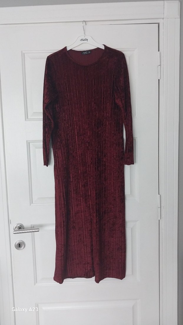 Bordo renkli, uzun, piliseli ve bol kesim elbise. Uzun kollu, yuvarlak yaka ve yumuşak kadife kumaştan yapılmıştır.