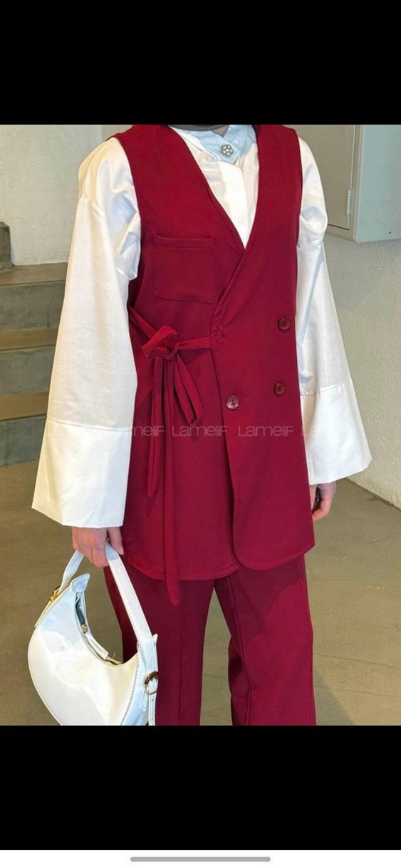 Bordo renkte, kemerli ve kolsuz kadın takımıdır. Normal boy midi kesim, regular fit ve notched lapel yakaya sahiptir. Ofis için uygundur.
