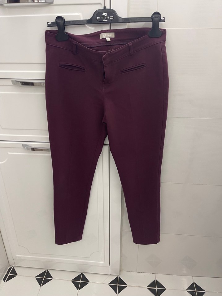 Bordo renkte, kemerli ve midi boy kadın kumaş pantolon. Regular fit kesim ve ipeksi dokusuyla ofis için şık ve rahat bir tercih.