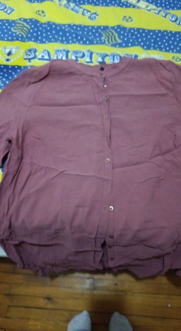 Bordo renkli keten gömlek, düğmeli, uzun kollu, yuvarlak yaka ve normal midi boyda, rahat kesimlidir. Günlük kullanıma uygundur.