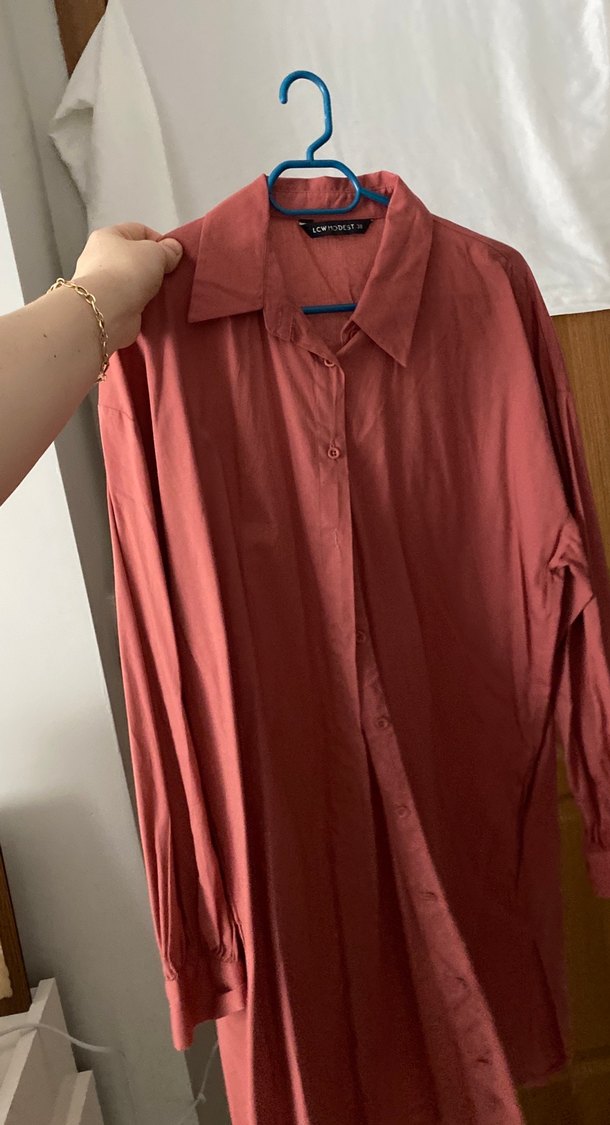 Bordo renkli keten kumaştan, düğmeli ve yakalı, uzun kollu, normal midi boyda bol kesim kadın gömlek. Günlük kullanıma uygundur.