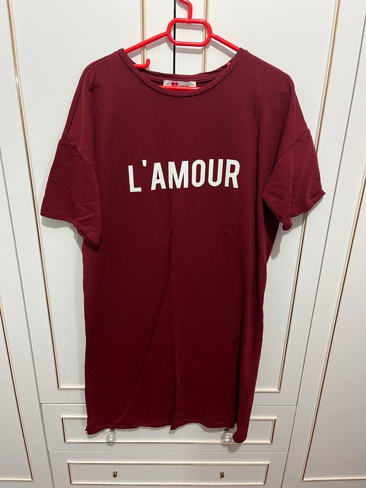 Bordo renkli, pamuk kumaştan, kısa kollu ve yuvarlak yakalı bol kesim tişört. "L'AMOUR" baskılı diz üstü baharlık elbise