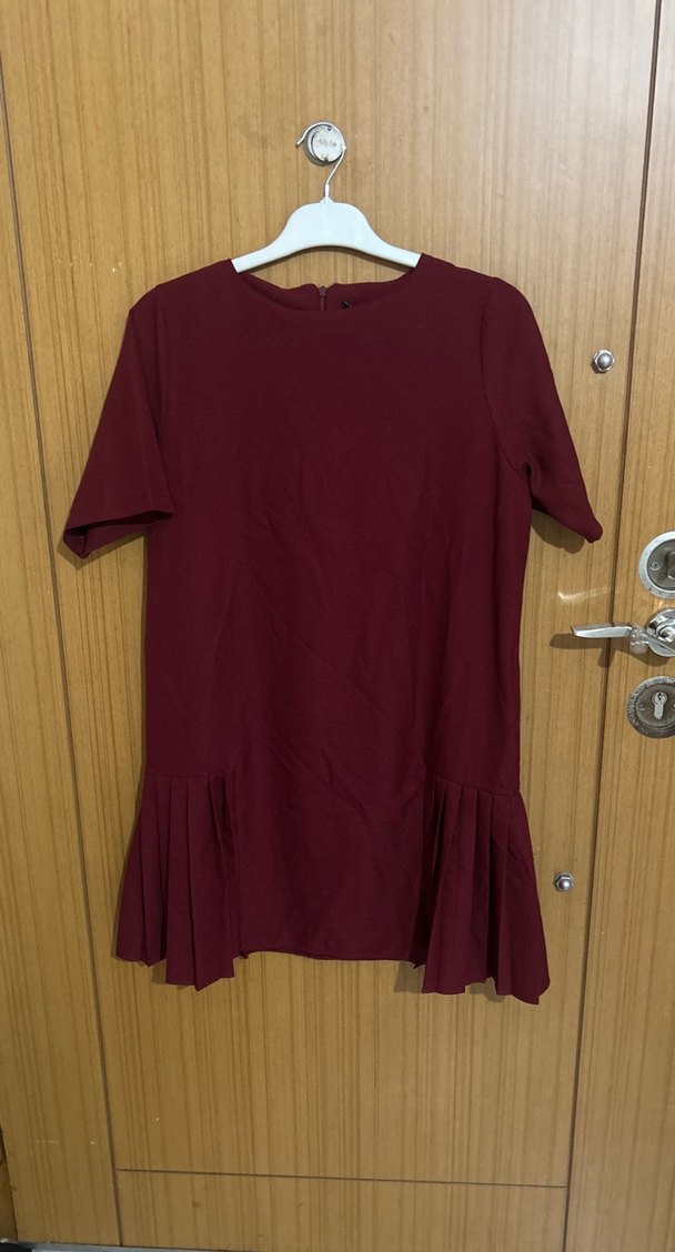 Bordo renkli kadın elbise , kısa kollu ve yuvarlak yaka detayına sahiptir. Pilili etek ucu ve bol kesimiyle günlük kullanıma uygundur.