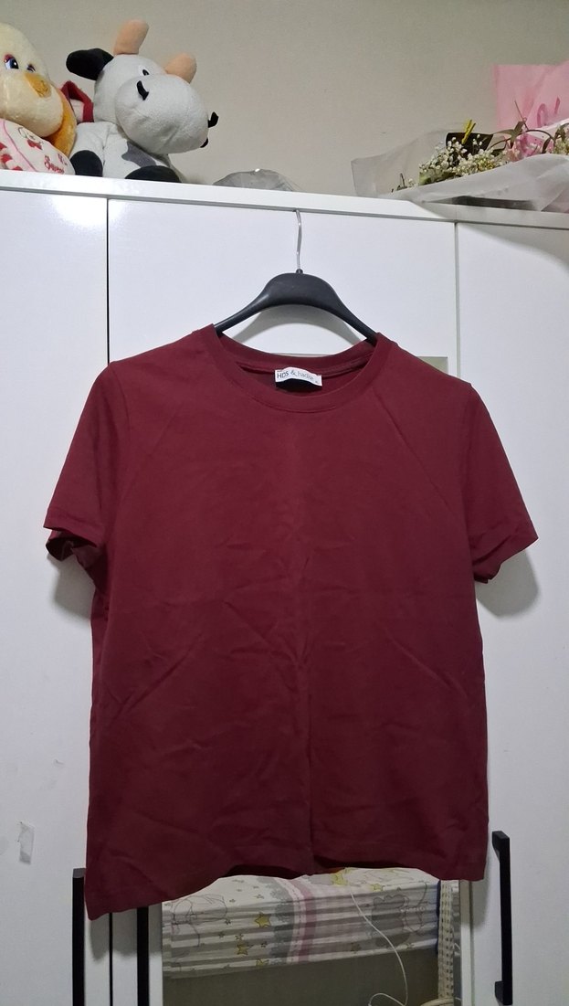 Bordo renk, kısa kollu, yuvarlak yakalı kadın tişörtü. Sentetik kumaştan, rahat kesim ve desensiz, günlük sokak stiline uygun.