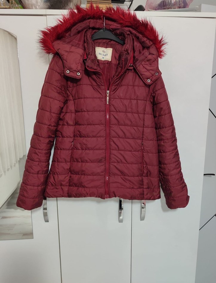 Bordo renkli, kürklü kapüşon ve askılı kollu, yumuşak sentetik kumaştan üretilmiş, vücuda oturan kışlık mont. ️