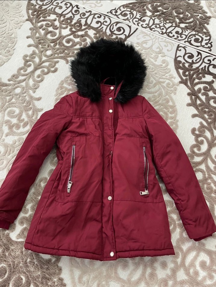 Bordo renkli, kürklü kapüşonlu, yumuşak dokulu kadife kumaştan yapılmış, uzun kollu, normal boyda ve dar kesim kadın kışlık mont.