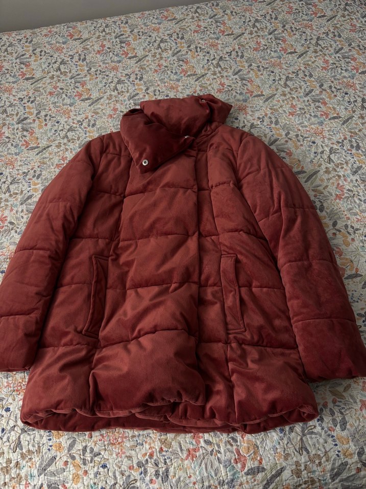 Bordo renkli, yüksek yakalı ve uzun kollu kadın kışlık mont. Yumuşak fleece kumaş ve kürk detaylı, bol kesim ve midi boyda, rahat ve bohem tarzda günlük kullanım için uygundur yeni gibi