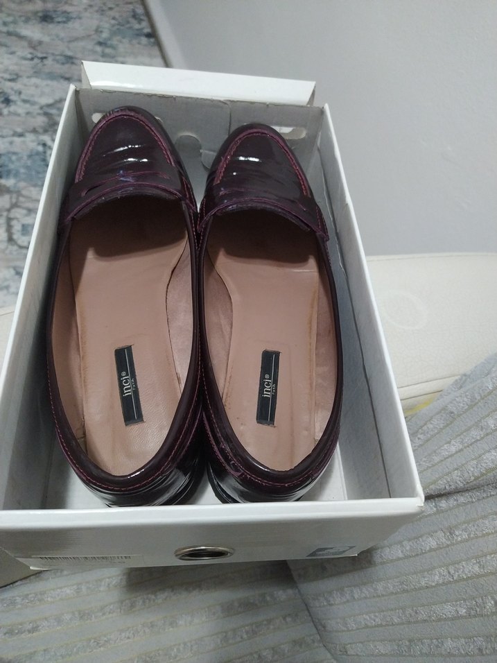 bordo renkli, blok topuklu, plise detaylı, kauçuk malzemeden kadın klasik ayakkabısı, ofis ve gündelik iş stiline uygun orjinal inci marka 49 numara son fotoğrafta uç kısmında hafif kullanıma engel olmayan defo mevcut dikkatli bakiniz