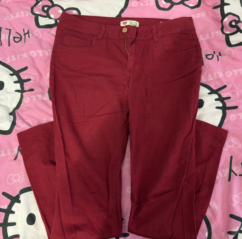 Bordo renk, düğmeli,desen içermeyen, günlük rahat kullanıma uygun kadın pantolon.