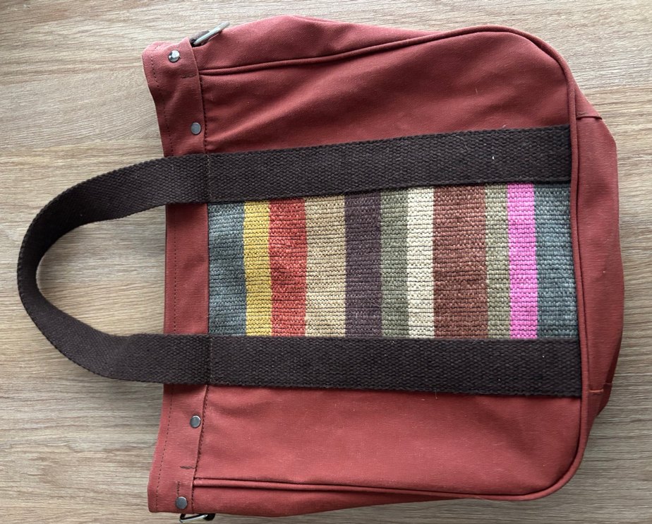Bordo renkte, tokalı kumaş kadın çanta, çok renkli çizgili askıya sahip, günlük kullanıma uygun bohem tarzda.