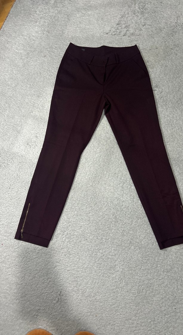 Bordo renk, normal boy midi kesim kadın pantolon. Düz dokulu sentetik kumaştan, fermuar detaylı ve rahat kesim, ofis ve sokak stiline uygun.