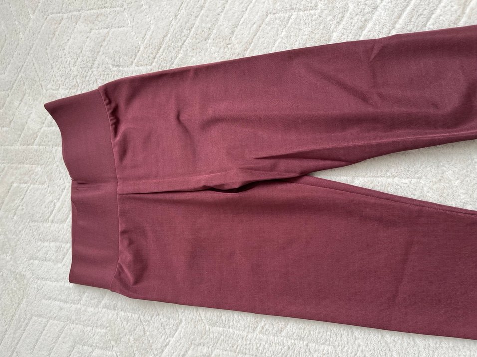 Bordo renkli, yumuşak sentetik kumaştan yapılmış, günlük kullanıma uygun midi boy, düz kesim rahat kumaş pantolon.