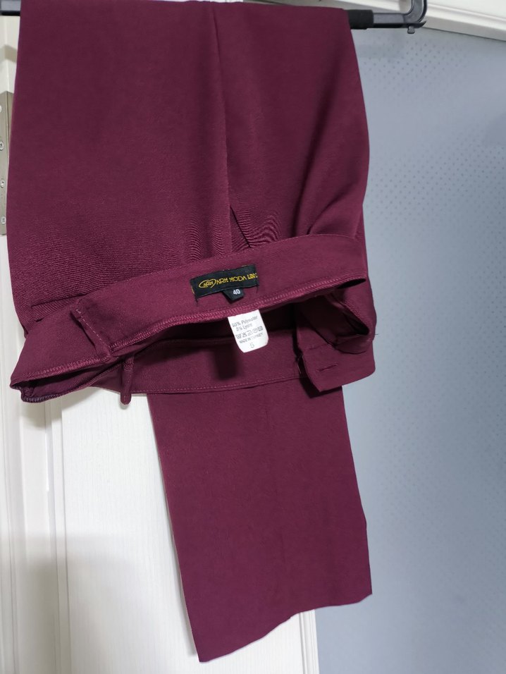 Bordo renk, normal boy midi kumaş pantolon. Silky kumaştan, fermuarlı, düz desensiz, ofis için uygun, normcore ve athleisure tarzda.