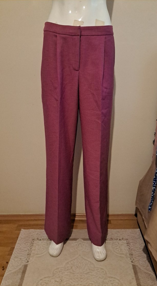 Bordo renkli, pilili, düz kesim kadın kumaş pantolon. Sentetik, yumuşak dokulu kumaştan, midi boy ve ofis kullanımı için uygun.