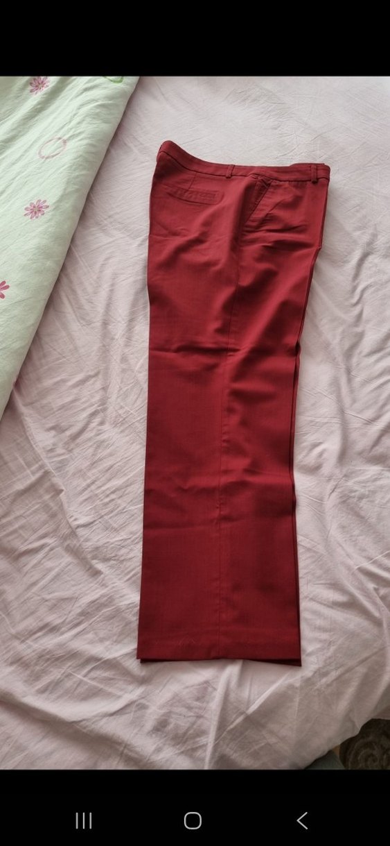 Bordo renkli, kadınlar için normal boy ve regular fit kumaş pantolon. Yumuşak sentetik kumaştan, pilili detaylı ve parlak görünümlü, günlük kullanım için uygun.