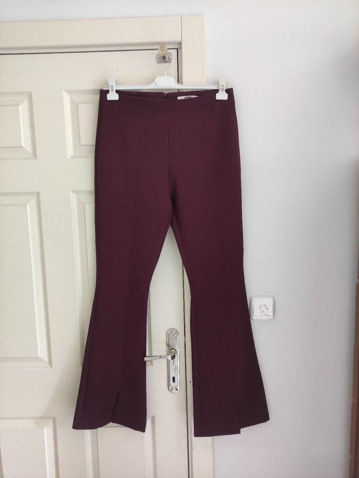 Bordo renkli, yırtmaç detaylı, midi boy kadın pantolon. Sentetik kumaştan üretilmiş, minimal ve şık bir görünüme sahip, ofis için uygun.