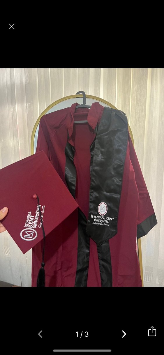 Bordo renkli, notched lapel yakalı kadın mezuniyet elbisesi. Parlak desenli, midi boy, kolsuz ve düzenli kesim. Kep ve püskül detaylıdır. Kent üniversitesi