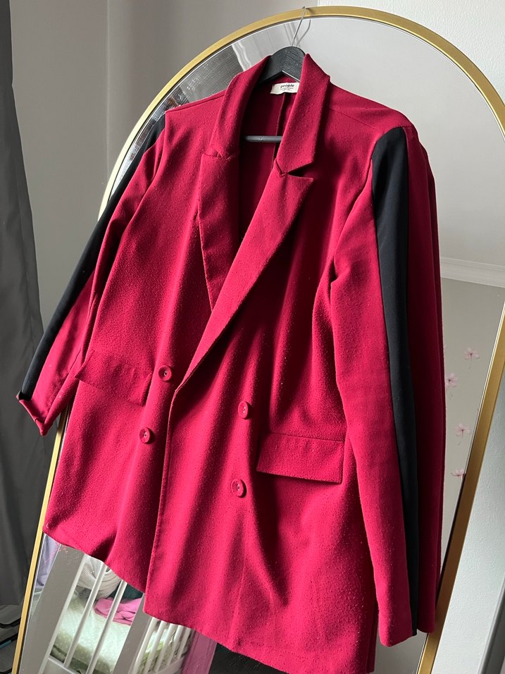 Bordo renkli kadın blazer, kesik yakalı ve düğmeli ön detaylıdır. Normal kesim, uzun kollu ve midi boydadır. Sentetik kumaştan üretilmiş, desen içermeyen ofis ve günlük tarzına uygundur.