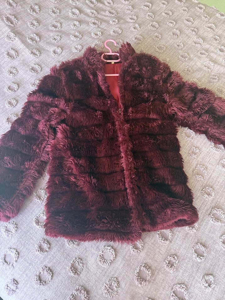 Bordo renk, uzun kollu, kürk detaylı, midi boy, yumuşak ve sıcak kumaştan yapılmış, bohem ve retro tarzına uygun, parti için ideal bir ceket.