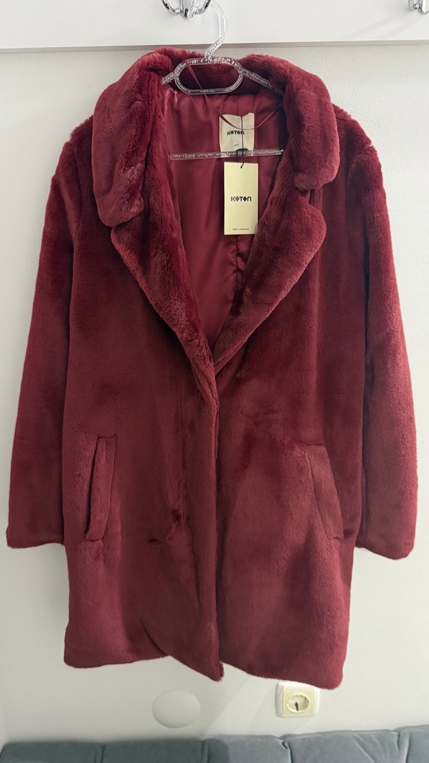 Bordo renkli, midi boy, yumuşak kumaşlı kadın mont. Kürk detaylı, yakası kesik, uzun kollu ve bol kesimdir. Ofis ve gündelik kullanıma uygundur.