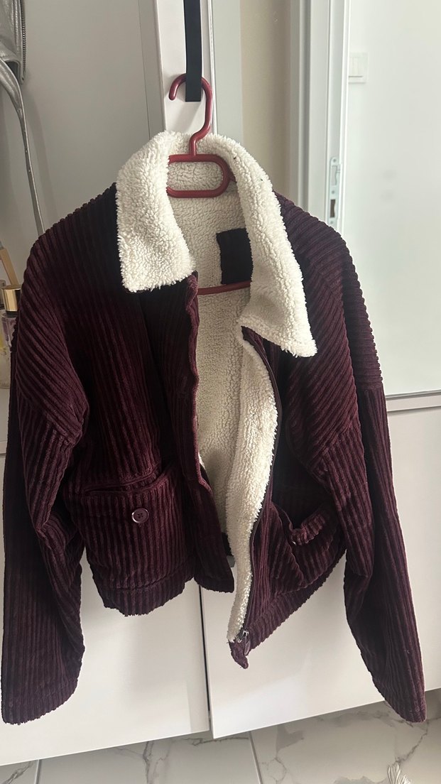 Bordo renkte, uzun kollu ve yakalı bu kadın ceketi yumuşak kumaştan olup içi kürklüdür. Midi boy, bol kesim, günlük sokak stiline uygundur.