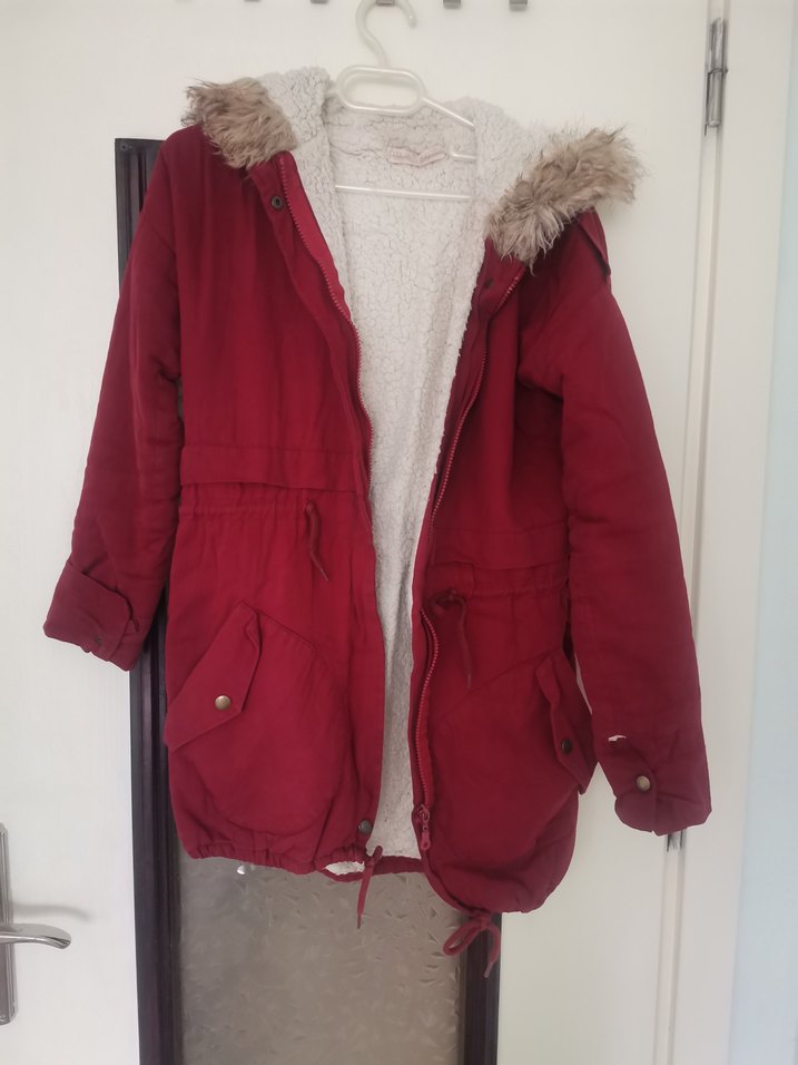 Bordo renkli, kapüşonunda kürk detaylı, uzun kollu ve notalı yaka kesimli, rahat kesim midi boy kadın kış montu. İç kısmı yumuşak ve sıcak tutan kumaşla kaplıdır. İhtiyaç fazlası olduğu için satılıktır kusuru yoktur
