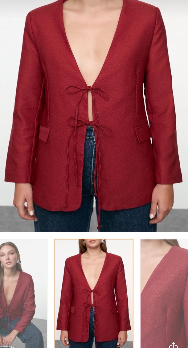 Bordo renkte, yakası kesik ve strappy kollu kadın midi ceketi. Düğmeli ön kısmı ve düzenli kesimiyle günlük sokak modasına uygun, sade ve şık bir tasarım. ürün hiç kullanılmadı yeni