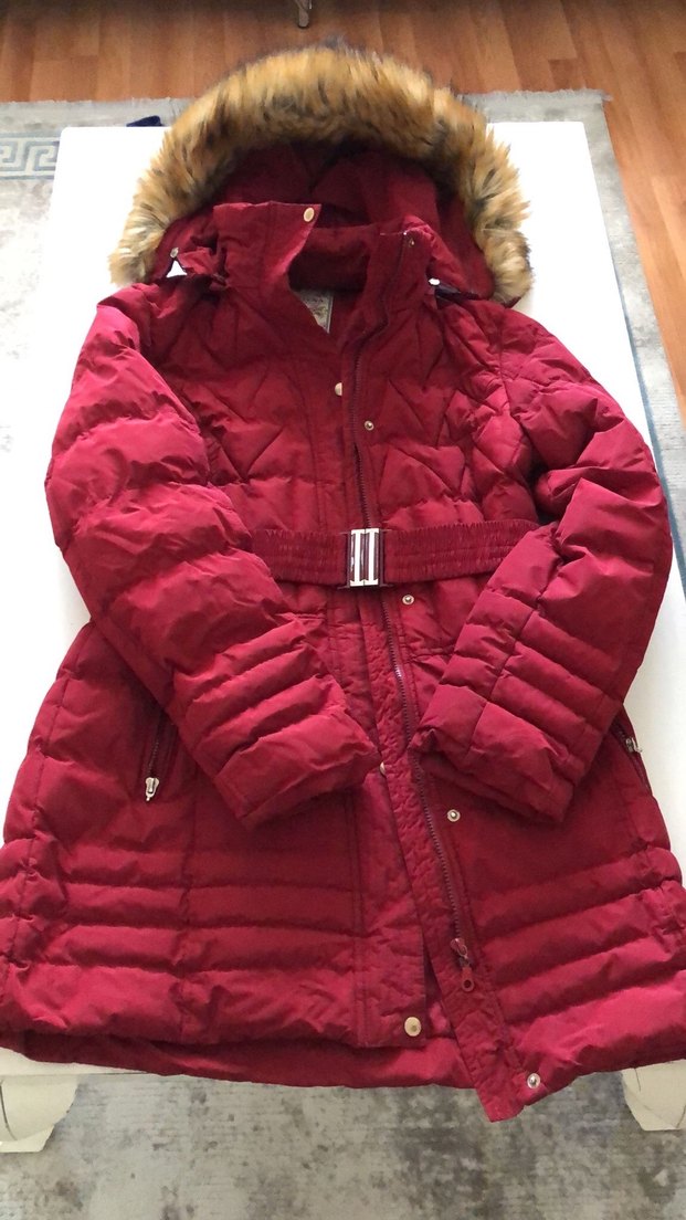 Bordo renkli, kemerli ve uzun kollu kadın kışlık mont. Yumuşak ve sıcak kumaştan, parlak görünümlü, günlük kullanıma uygun rahat bir model. AA yazısı bulunur. ❄️ aşırı sıcak tutar XXL yazıyor fakat ama terzide daralttırıldı L bedene uygundur