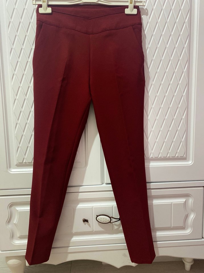 Bordo midi uzunlukta kadın pantolon, regular fit kesim ve yumuşak sentetik kumaş ile ofis için şık ve rahat bir görünüm sunar. Düz ve koyu renklidir.