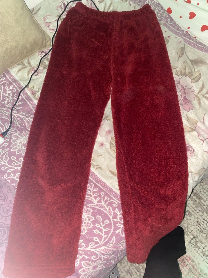 Yumuşak ve sıcak kumaştan, bordo renkli, bol kesim ve peluş detaylı midi boy kadın pantolon. Desensiz, rahat sokak stili için uygundur.