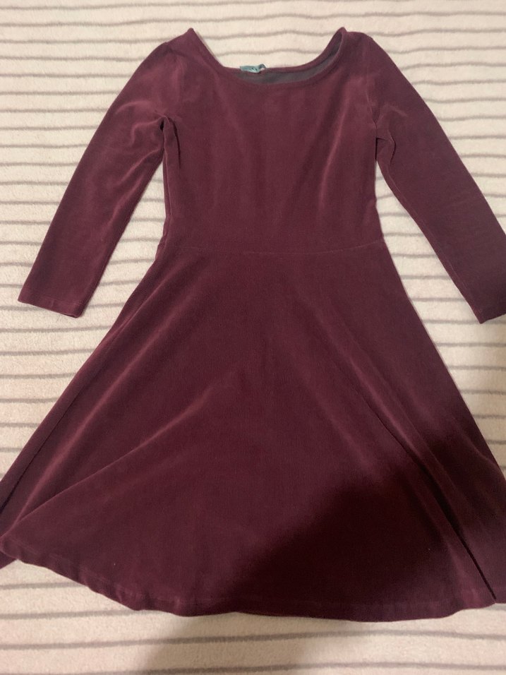 Bordo renkte, yarım kollu ve kayık yaka elbise. Yumuşak süet kumaştan, beli oturan şık bir parça.