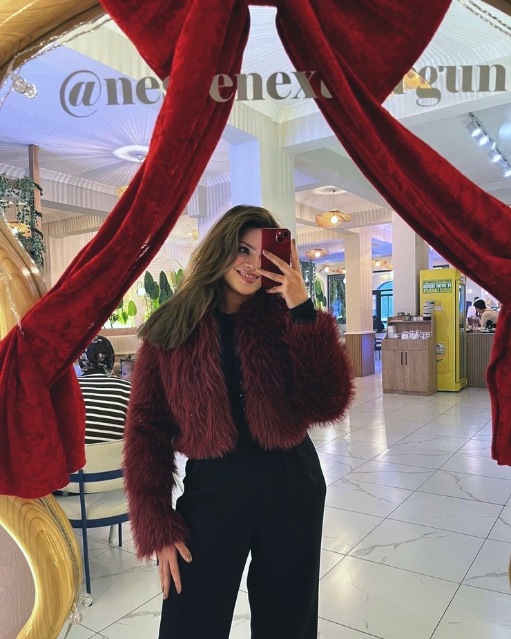 Bordo renkli, uzun kollu ve suni kürkten yapılmış, notalı yaka detaylı, fitted kesim midi uzunluğunda kadın ceketi. Goth tarzıyla cesur parti kombinlerine uygundur.