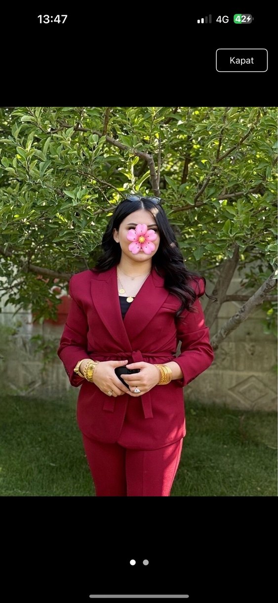 Bordo kadın takımı, saten dokulu, normal boy midi kesim ve çiçek desenlidir. Notlu yaka ve kabarık uzun kolludur, günlük ve özel davetlere uygundur.