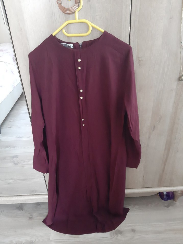 Bordo renkli, uzun kollu, yuvarlak yakalı, düğmeli midi tunik. İnce ve hafif parlak kumaştan, bol kesim, sade ve bohem tarzda günlük kullanıma uygun. Ürün 48 beden olarak geçiyor ama 40 bedenliyseniz rahatça olur Ürün fotograftakinden bir tık daha koyudur Ürün 2 kez kullanıldı Herhangi bir defosu veya kusuru yok